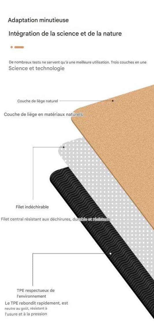 Nettoyez régulièrement votre tapis avec un mélange d'eau et quelques gouttes de savon doux ou de vinaigre blanc. Vaporisez légèrement la surface, essuyez avec un chiffon humide, puis laissez sécher à plat loin du soleil direct. Pour les tapis en caoutchouc naturel ou en liège, évitez les produits agressifs qui pourraient endommager le matériau.